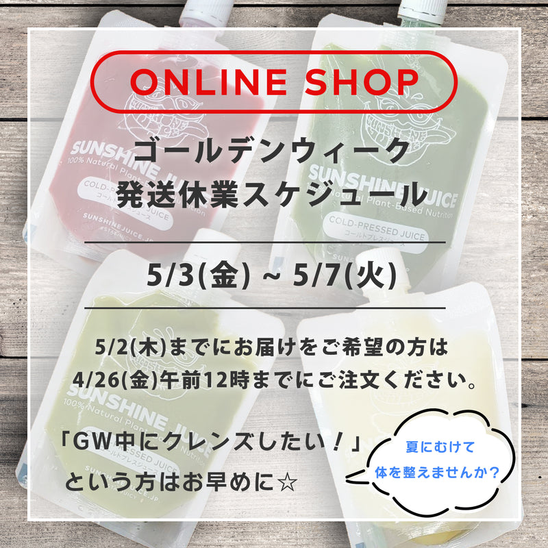 SunshineJuiceでむくみや疲れをスッキリさせて連休中も健やかに楽しくお過ごしください。